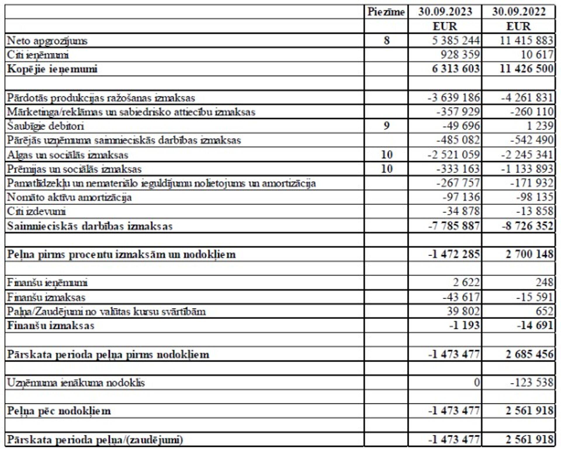 No peļņas / zaudējuma aprēķina augstāk var novērot, ka apgrozījuma kritumam ir sekojis arī vispārējs izmaksu samazinājums, salīdzinot ar iepriekšējā gada to pašu ceturksni. Un tomēr, izmaksu samazinājums nav bijis pietiekams, kas rezultējies aptuveni 1.5 milj. eiro zaudējumos, salīdzinot ar iepriekšējā finanšu gada 3 mēnešu periodu, kad peļņa bija ap 2.6 milj. eiro.