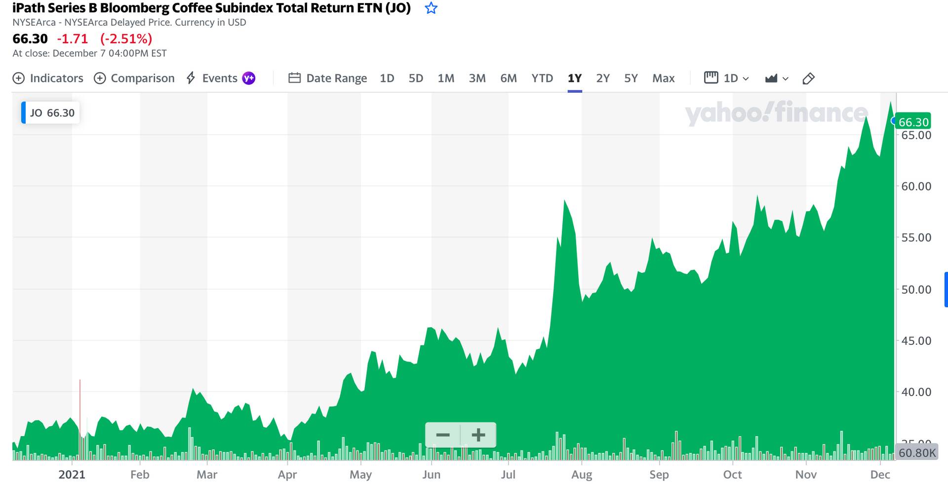 - Foto: iPath Series B Bloomberg Coffee Subindex Total Return ETN (JO) vērtība, ASV dolāri
